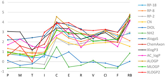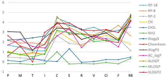 Additionally, a linear regression analysis was applied to establish the suitability of the tested chromatographic conditions and the validity of the computer programs. Therefore, linear regression plots were calculated for obtained experimental RM0 values of the analytes studied, which were determined after using six tested adsorbents in Met/water and Ac/water system according to the equation: RM0(1) = b + a RM0(2). The detailed data for established linear regression plots, such as the values of a and b, the standard errors of the slope, interception and estimate (Sa, Sb, Se), as well as the correlation coefficients (r, r2), are reported in Table S6. Linear regression analysis was also performed for data sets describing the experimental RM0 of the tested substances calculated in both mobile phase systems and logPcal parameters according to the equation: RM0 = b + a logPcalc. A detailed description of the obtained results is shown in Table S7. Moreover, regression plots of logPcal parameters calculated by seven different computer programs according to the equation: logPcal(1) = b + a logPcalc(2) were also calculated, and these results are presented in Table S8. Table 3 shows the correlation coefficients (r) obtained for the linear correlation between the experimental RM0 values of the compounds of interest, established after using six different adsorbents in Met/water system (white area) and in Ac/water system (grey area). The correlation coefficients calculated between RM0 and logPcal parameters, as well as for the analytes measured by the seven tested computer programs are also shown in Table 3. These data are presented in italics. These summarized data indicated that high correlations between the experimental RM0 parameters for the compounds of interest (r > 0.8375) were established between RP-18/RP-8, RP-18/RP-2, and RP-18/CN, independent of the type of organic modifier used in the mobile phase (Table 3 and Table S6). These correlation coefficients were lower when they were established in respect to NH2 (r from 0.4055 to 0.5601 and 0.5023 to 0.6500 for the Met/water and Ac/water system, respectively). The worst relationships of RM0 values calculated for the compounds of interest were found when they were compared to those established after using DIOL in both tested experimental conditions (from 0.0556 to 0.2770 and in the range of 0.0394–0.1266 for Met and Ac, respectively). Taking into account the correlation obtained between the experimental RM0 values of the analytes measured after using Met as the organic modifier and logPcal parameters, these values were higher than 0.7094 when RP-18/AlogPs, RP-18/ChemAxon, RP-18-MLOGP, RP-18/XLOGP2, RP-2/ALOGP, CN/ALOGP and NH2/ChemAxon were used. When the experiments were performed using Ac, the correlation for AlogPs compared to RP-18, RP-2; ChemAxon with RP-18, RP-2 and NH2, as well as ALOGP with RP-18, RP-8, RP-2, CN, and NH2, as well as MLOGP with RP-18, RP-2 and CN, also including XLOGP2/RP-18 and XLOGP2/CN was in the range of 0.7086–0.9213 (Table 3 and Table S7). High relationships were found for lipophilicities established by the computer programs, including AlogPs with ChemAxon, ALOGP, MLOGP and XLOGP2 (from 0.8431 to 0.9251), ChemAxon with ALOGP (0.9136) and MLOGP (0.9183) and between ALOGP and MLOGP (0.9562) or XLOGP2 (0.8678), as well as MLOGP with XLOGP2 (0.8583) (Table 3 and Table S8).