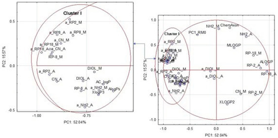Increasingly, thanks to computerized multidimensional data analysis procedures, it is possible to extract systematic information, often dispersed in large data sets. Upon application of chemometric methods (e.g., principal component analysis (PCA), cluster analysis (CA)), the number of variables in a data set is reduced by finding linear combinations of the variables that explain most of the data variability [60,61,62]. PCA allows for a more objective and rational estimation and comparison of the determined lipophilicity. The scores corresponding to the first principal component appears to be one of the best solutions for the lipophilicity scale, resulting from retention data. In addition, a careful investigation of eigenvalues and eigenvectors (loadings) can offer useful information concerning the retention mechanism of the compounds [63,64].On the other hand, CA is a technique that consists of grouping similar observations into several clusters based on the observed values of several variables, the concept of which is similar to the discriminant analysis [65].