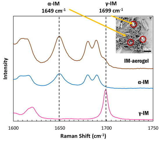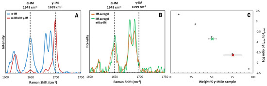 Raman spectroscopy was also used to quantify the amount of each form within the aerogel. A standard curve (the dashed line in Figure 3) was prepared using binary mixtures of α and γ polymorphs and plotting the ratio of the peak intensities at 1649 cm−1 and 1699 cm−1 for each sample. Using this curve, the amount of γ-IM in the aerogel was determined to be approximately 15 wt% ± 8 wt% (as indicated by the brown X in Figure 3), which indicated that most of the IM in the aerogel recrystallized as the α-form.