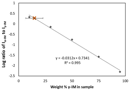 Standard curve (dashed line) showing ratio of α to γ peak intensities compared to weight percent of gamma in the binary mixture. Amount of γ-form in IM-aerogel shown using brown X and the error bar indicates standard deviation based on 5 measurements.