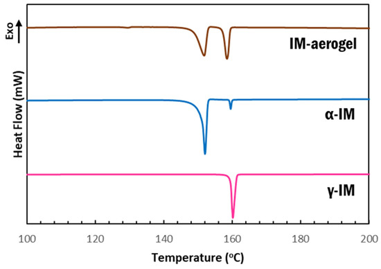 DSC thermograms of IM samples: pink-as received γ-IM; blue-recrystallized α-IM; and brown-IM recrystallized within aerogel.