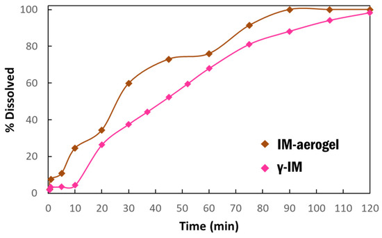 Dissolution studies were performed to compare the dissolution behavior of IM in the aerogel to the as-received material (Figure 5). The dissolution was run for 2 h and it showed that the IM-aerogel samples have a faster dissolution rate, reaching 100% dissolution in 90 min. In comparison, the γ-IM samples were less than 90% dissolved at 90 min. and they reached 98% dissolution at 120 min.