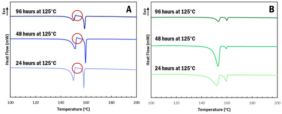 DSC scans after thermally holding (A). α-IM and (B). IM-aerogel samples at 125 °C for up to 96 H. Red circles indicate the recrystallization exotherms present in the α-IM samples.
