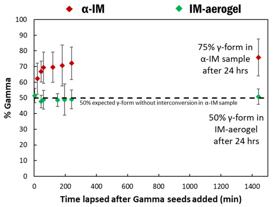 % γ-IM in the samples as a function of time after adding γ-IM seed crystals to α-IM (red) and IM-aerogel (green) samples. The black line represents the 50% mark, which would be the maximum γ-IM amount from adding the seed crystals.