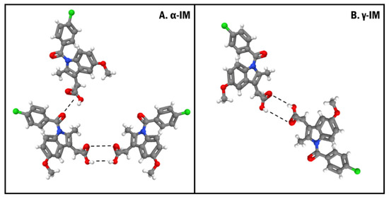 Crystal orientations showing the hydrogen bonding (dashed lines) between (A). α-form and (B). γ-form of indomethacin. Both forms contain a strongly bonded dimer between two carboxylic acid groups and the α-form also contains an additional hydrogen bond between a carboxyl group and an adjacent amide carbonyl group.