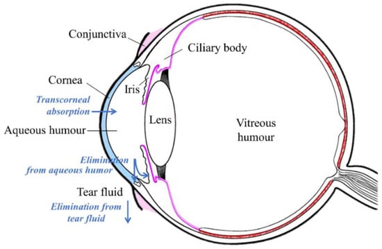 Topically applied eyedrops are the most commonly used dosage form in ocular drug treatment. They are used in the treatment of anterior segment diseases, such as infections, inflammatory conditions, and glaucoma. Nevertheless, ocular bioavailability of drugs after eyedrop administration to rabbits is limited to less than 5% of the instilled dose, often less than 1% []. This is due to several limiting factors: (1) the permeation barrier of the corneal epithelium []; (2) rapid drainage of the instilled drug from the ocular surface []; and (3) effective transconjunctival drug absorption into the systemic blood circulation [,]. In humans, the blinking rate and solution drainage from the ocular surface is also fast and the corneal barrier is tight, indicating low ocular bioavailability []. Topical ocular drug delivery is illustrated in Figure 1.
