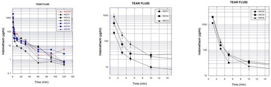 Indomethacin concentrations were monitored in the tear fluid after topical instillation of the ophthalmic suspensions to the rabbit eyes. It is evident that the particle size and viscosity have an impact on the time course of indomethacin concentrations in the tear fluid (Figure 2, left). Increased viscosity in the suspension prolongs the drug retention in the tear fluid, whereas the smaller particle size decreases indomethacin retention in the tear fluid (Figure 2, middle, right).