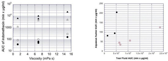 Left: Ocular indomethacin pharmacokinetics in the rabbits. AUC values for mean indomethacin concentrations in the aqueous humor (circles) and tear fluid (triangles) are shown. The clear symbols describe the data from small (mean size 0.4–1.3 µm) suspension particles, and the filled symbols are for the large particles (mean size 3.1–3.5 µm) at three different viscosity levels (x-axis). Right: Plot of AUC in aqueous humor vs. AUC in tear fluid. The filled symbols are for the larger particles (mean size 3.1–3.5 µm) and clear symbols for the smaller particles (mean size 0.4–1.3 µm). Indom is included as medium viscosity formulation with large particles in both figures.