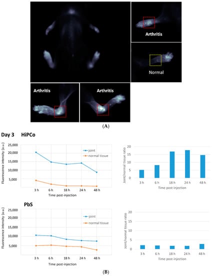 (A) Body image of mice 6–9 h after injection. Accumulation of HiPco single-walled carbon nanotubes (SWNTs) Cy5.5 in arthritis joints. (B) Relative fluorescence intensity of HiPco and lead sulfide/cadmium sulfide core/shell quantum dots (PbS) in joint and normal tissue (left); ratio of fluorescence intensity between joint and normal tissue for HiPco and PbS (right).
