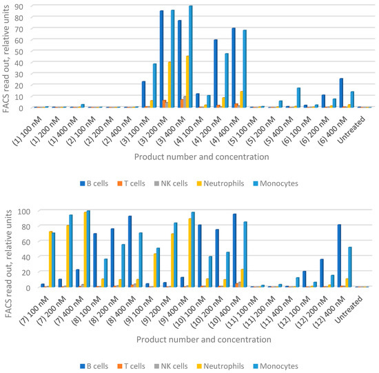 With the joint accumulation established by the in vivo data for HiPco-SWCNTs, we proceeded with testing drug-loaded variants. We aimed to determine whether functionalized nanotubes can specifically target any immune cells and therefore function as a drug carrier for RA treatment. We synthesized solubilized nanotubes loaded with MTX or siRNA, or both (Table 1). Human whole blood was incubated with products C1–C12 for 30 min at 37 °C followed by flow cytometry analysis (FACS; see Section 2.11). The obtained flow cytometric data is summarized in Figure 2 and shows that both types of PEGylated nanotubes are taken up by circulating B cells, monocytes and neutrophils in a dose-dependent manner (Hipco-SWCNTs for 1–6 and carboxyl-SWCNTs for 7–12; Figure 2). Notably, nearly 60% of B cells take up the nanotube products compared to 35~40% of monocytes at 400 nM.