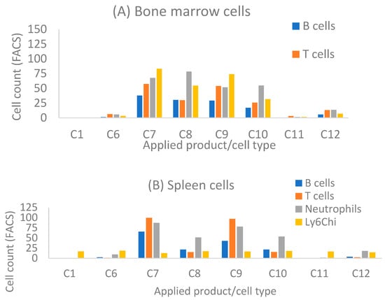 FACS results for nanotube products taken up by particular mouse immune cells in bone marrow (BM) (A), and spleen (B). BM and splenocytes were isolated from B6 mice and incubated with designated SWCNTs at 200 nM for 30 min. See details in Section 2. Applied products were as follows: Exchange (HiPco SWCNTs), 1. siNOTCH/MTX; 6. Not loaded nanotubes; Direct (carboxyl-SWCNTs), 7. siNOTCH/MTX, 8. siNOTCH, 9. siRNA/MTX, 10. siRNA, 11. MTX, 12. Not loaded nanotubes.
