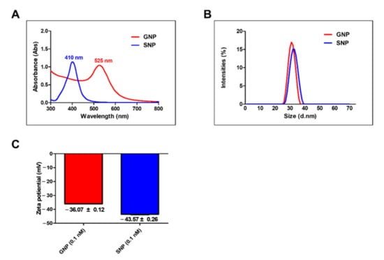 To measure the sizes of the GNPs and SNPs, we used UV-Vis spectroscopy (Figure 1A). In the GNP group, the maximum absorbance was shown at 525 nm. In the SNP group, the maximum absorbance was at 410 nm. The diameter of the GNPs was 26–36 nm and the diameter of the SNPs was 27–38 nm (Figure 1B). GNPs and SNPs have different maximum absorbance wavelength each ranging from 400 to 800 nm and 200 to 800 nm, respectively [17,25]. The maximum absorbance wavelength of GNPs and SNPs increase in accordance with the size [17,26]. We confirmed that the sizes of the GNPs and SNPs were similar. The surface charges of the GNPs and SNPs were measured using the zeta potential (Malvern). The surface charge of the GNPs was −36.07 mV ± 0.12 and that of the SNPs was −43.57 mV ± 0.26 (Figure 1C). GNPs and SNPs have the surface charge around −40 mV.