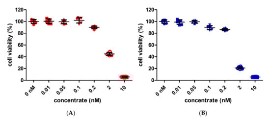 The cytotoxicity was evaluated at the various concentrations (0, 0.01, 0.05, 0.1, 0.2, 2, and 10 nM) of GNPs and SNPs. BMMs were seeded at 1.2 × 105 cells on 48-well culture plates. After one day, the medium was changed, and a fresh medium was added containing a predetermined concentration of GNPs or SNPs. Cytotoxicity was measured using a cell counting kit (EZ-Cytox) at 48 h. The cells were washed with Dulbecco’s phosphate-buffered saline (DPBS). BMMs were replaced with fresh medium containing EZ-Cytox (500 μL of 0.1 mL/mL). After incubation for 2 h, the absorbance was measured at 450 nm with a microplate reader (Bio-Rad, Hercules, CA, USA). The absorbance of the 0 nM (without GNPs or SNPs) group at 48 h was fixed at 100% and the absorbance levels of the other groups were calculated relative to that level.