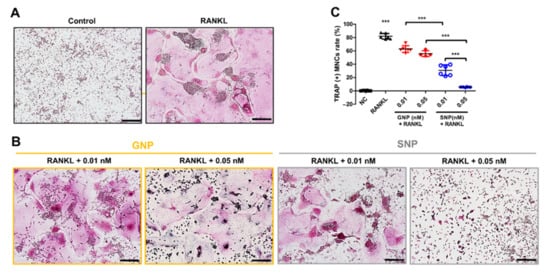 RANKL-induced tartrate-resistant acid phosphatase (TRAP) assay outcomes with GNPs or SNPs. BMMs were differentiated into osteoclasts with a complete culture medium (CCM, with RANKL medium) for five days. (A) BMMs of the control group were cultured with CM. BMMs of the RANKL group were cultured with CCM (without GNPs and SNPs). Scale bars: 200 μm. (B) TRAP+ multinuclear cells (MNCs) were stained at various concentrations of GNPs or SNPs. Scale bars: 200 μm. (C) The TRAP+ MNCs were quantified. The results are expressed as the mean ± SD (n = 6 per group). “***” indicates a significant difference for which p < 0.001.