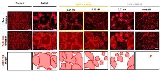 BMMs were seeded at 2 × 105 cells on a confocal culture dish (SPL, Seoul, Korea). The control group was cultured with CM, and the RANKL group was cultured with CCM for 5 days. BMMs were differentiated into osteoclasts with CCM containing two concentrations (0.01 and 0.05 nM) of GNPs and SNPs. After five days, the cells were fixed by soaking in 4% paraformaldehyde for 15 min and washed three times with DPBS. The cells were placed in 0.1% Triton X-100 for 5 min at room temperature and washed three times with DPBS. Fixed cells were stained with rhodamine-conjugated phalloidin (1:400 dilution) at room temperature for 30 min and washed three times with DPBS. The actin ring formation process was observed using a fluorescence microscope (Olympus IX71). The ROIs (1200 × 1000 μm, n = 4) were also randomly designated.