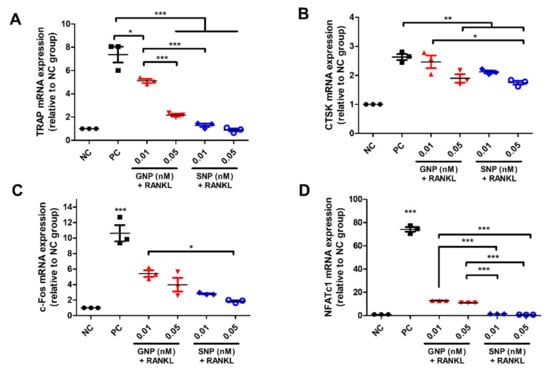 The mRNA expression level of (A) TRAP, (B) Cathepsin K (CTSK), (C) c-Fos, and (D) Nuclear activated T-cells, cytoplasmic 1 (NFATc1), with various concentrations of GNPs or SNPs. BMMs were differentiated into osteoclasts with CCM for five days. BMMs of the negative control (NC) group were cultured with CM. RANKL-induced BMMs of the positive control group (PC) were cultured with CCM. The mRNA expression levels at various concentrations of GNPs or SNPs were measured. The results are expressed as the mean ± SD (n = 3 per group). “*” indicates a significant difference for which p < 0.05. “**” indicates a significant difference for which p < 0.01. “***” indicates a significant difference for which p < 0.001.