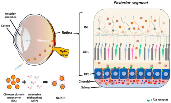Strategy for transport through the retina with chitosan-functionalized pluronic-based nanocarrier (NC)–ATP. NC has a positive charge due to chitosan (marked as “+”) and ATP has a net negative charge. NC–ATP was simply prepared by mixing via electrostatic interaction. NC/ATP was intravitreally administered.