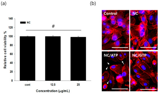 After mixing ATP and NC to form NC–ATP, NC–ATP was administered to the ARPE-19 cell layer for 30 min. The ARPE-19 cell layer was then stained with phalloidin dye to see the cells’ morphology. Because the P2Y receptor is linked to the actin cytoskeleton, the P2Y receptor agonist is known to initiate cytoskeletal rearrangements [14,22]. As shown in Figure 2b, some reduction in actin filament stretching, leading to the round morphology of cells, was observed in the NC–ATP compared with the control, the NC group, or even the NC–GTP group. It was reported that ATP can induce cell rearrangement associated with the P2Y receptor [23,24,25]. Thus, this result suggested the activity of ATP in NC–ATP in the rearrangement of ARPE-19, possibly mediated by the P2Y receptor.