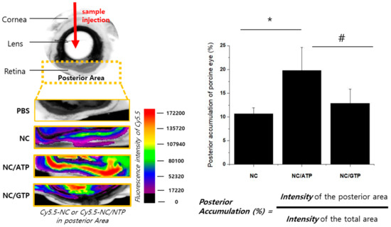 Ex vivo Cy5.5–NC or Cy5.5–NC–negatively charged ATP (NTP) distribution in porcine eyes and accumulated amount on the posterior area (n = 3). The fluorescence of Cy5.5 was measured by a fluorescence imaging system. Statistical analysis by t-test: *: p ≤ 0.05; #: p > 0.05.