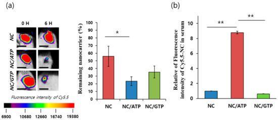 After intravitreal administration of NC–NTP, retention of Cy5.5–NC in the eye was monitored by a fluorescence imaging system. At 6 h after injection, still more than half (56%) of the initially injected NC remained in the eye. In contrast, NC–ATP showed a substantially lower (23%) amount remaining in the eye. NC–GTP also showed a similar tendency of a reduced amount (35%). The remaining amount of NC/GTP was a little higher than that of NC/ATP, but the difference was not statistically significant (Figure 4a). This result seemed to be the opposite of the ex vivo results in Figure 3. However, in the ex vivo experiment, we analyzed the remaining sample in the posterior part of the whole eye during culture. Thus, the in vivo result obtained here showed more efficient efflux or clearance of the injected NC from the vitreous body to the outside of the eye by ATP or GTP, supporting the facilitated diffusion of NC inside the vitreous body. Various clearance routes for injected NC are available, so to analyze the penetration of NC across the retina, the fluorescence intensity of Cy5.5–NC in the serum was analyzed. As shown in Figure 4b, approximately nine times higher intensity of Cy5.5–NC was observed from NC–ATP compared with NC alone. This result strongly supported the efficient and positive role of ATP on the enhanced permeation of NC across the retina upon intravitreal injection. Interestingly, NC–GTP did not show any improvement compared with NC alone. Thus, although GTP is considered to be effective in facilitated diffusion inside the vitreous body, similar to ATP, it was not effective at all to promote the permeation of NC across the retina. The interaction between the P2Y receptor and ATP but not GTP has been reported [26,27,28]. This result suggests the potential role of the P2Y receptor in enhancing the permeation of NC across the retina. The nanocarrier could infiltrate into the choroid/sclera by the rearrangement of the retinal pigment epithelial cell layer with the P2Y receptors, leading to more efficient flow out to the blood in the choroid. [6] Based on the assumption of ~1 mL of total circulating blood volume in a mouse, the amount of NC in the blood was estimated to be significant, ~6.7% of the initially injected amount for NC–ATP.
