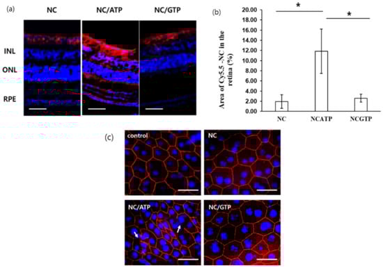 Immunocytochemical analysis was performed on the mouse retina to detect the tight junctions in the RPE with ZO-1. As shown in Figure 5c, the control, NC alone, and NC–GTP groups showed well-developed tight junction distribution. This result implies that the intravitreal sample injection in this experiment did not severely damage the retina to disrupt the RPE layer. In contrast, some disruption in the tight junction was observed only in the NC–ATP group, supporting the P2Y receptor-mediated rearrangement of the RPE cells, allowing the permeation of NC across the RPE.