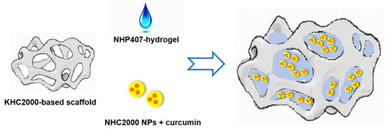 To evaluate the capability of the porous scaffolds to be combined with the hydrogel, 30 µL of NHP407-based sol-gel system (10% w/v concentration) was deposited on the surface of KHC2000 scaffolds (round samples with 6 mm diameter and 1.5 mm thickness) and the time required for complete absorption was evaluated by visual inspection. The whole procedure was carried out at 5 °C to keep the hydrogel in the sol state and to facilitate scaffold impregnation.
