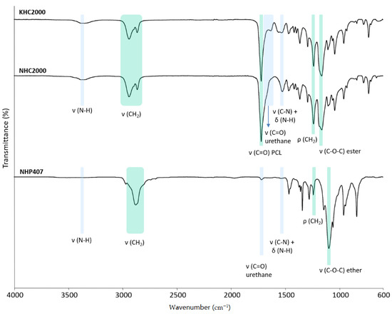 Attenuated Total Reflectance Fourier Transform Infrared (ATR-FTIR) spectra of KHC2000, NHC2000, and NHP407 poly(urethane)s. Light blue bars identify the characteristic peaks of newly formed urethane domains, and green bars refer to the typical bands of poly(ε-caprolactone) (PCL) and P407.