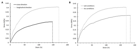 Stress–strain curves for KHC2000 scaffolds analyzed in different conditions: (A) in the cross-sectional and longitudinal directions in the dry state and at room temperature, and (B) in the longitudinal direction in wet and dry conditions at room temperature.