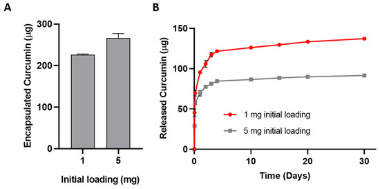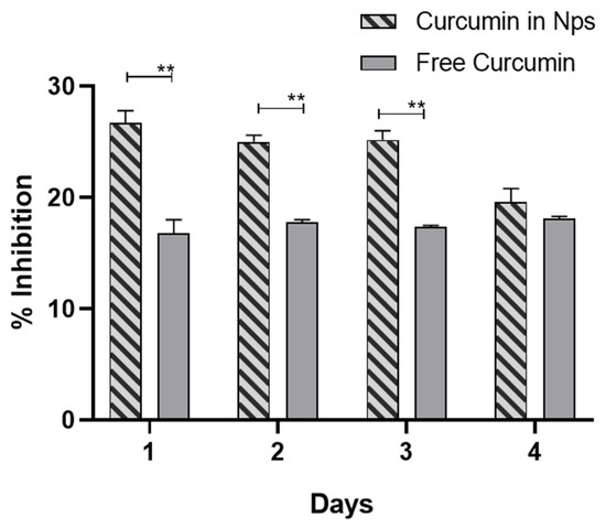 The amount of released curcumin from the 1- and 4-day timepoints was tested. Released curcumin was solubilized in 20 µL of methanol and added to 980 µL of a 0.25 mM methanol DPPH• solution. Control samples without curcumin and comparison samples with free curcumin at equivalent concentrations to the release solutions were also prepared. The decrease in absorbance was determined at 517 nm after 30 min incubation in the dark. The percentage inhibition of the DPPH radical was calculated according to Equation (4).
