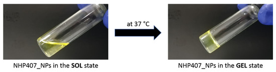 Thermosensitive hydrogels were prepared with NHP407 at a previously optimized concentration of 10% w/v in PBS [39]. Polymer solubilization was carried out at 5 °C overnight to avoid micellization and/or gelation during solution preparation.