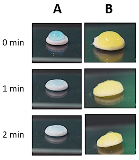Absorption of NHP407-based hydrogels by KHC2000 scaffolds: (A) hydrogel not loaded with the particles and (B) hydrogel loaded with NPs.