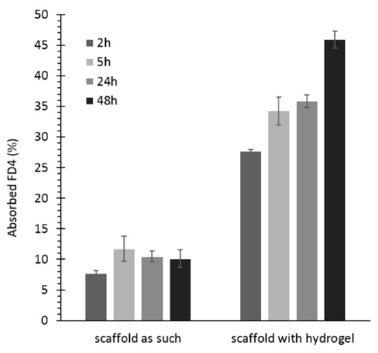 Percentage of absorbed FD4 by KHC2000 scaffolds as such and loaded with NHP407 hydrogel, measured at different timepoints (i.e., at 2, 5, 24, and 48 h of incubation). Significant results: p < 0.0001, p = 0.0002, p < 0.0001, p < 0.0001 for the results at 2, 5, 24, and 48 h, respectively (T-test).