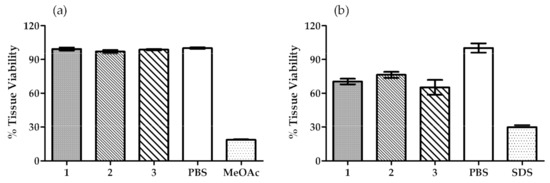 The skin irritation test was performed according to the method based on the Reconstructed Human Epidermis (RHE) model (EpiSkin ™ Skin Irritation Test—Episkin ™: Small Model, Lyon, France) [55]. The model is characterized by the presence of 0.38 cm2 of epidermis reconstructed with normal human keratinocytes and cells grown in a collagen matrix for 13 days. The test was performed with the OIBPE in three independent experiments (n = 3), using PBS as a negative control and SDS as a positive control. The results obtained are presented as a percentage of cell viability following the acceptance criterion defined by the method guideline No. 439 of the OECD [55].