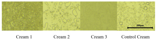 The formulations were prepared using a hot emulsification method (80 °C), where the oily and aqueous phases were melted separately. Thereafter, the oily phase was added to the aqueous phase at 80 °C and mixed with a vertical mixer (IKA® T25 Digital—ULTRA-TURRAX®, Staufen, Germany) at 8000 rpm for 5 min, followed by stirring using a vertical stirrer (IKA® EUROSTAR 60, digital, Staufen, Germany) at 400 rpm, until reaching room temperature (27–30 °C). The composition of the formulations is shown in Table 2.
