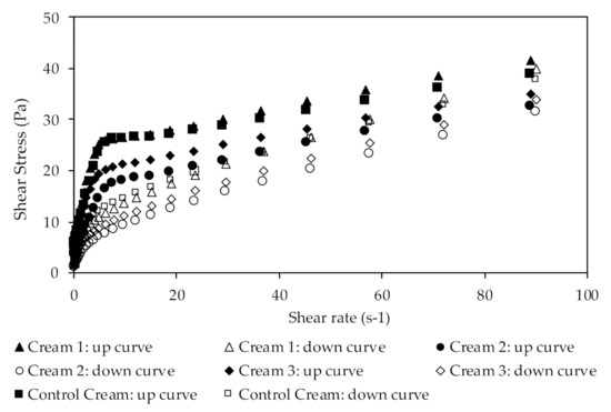 The shear rate method (table of shear rates) was performed using a destructive measurement, where the shear stress of each emulsion was obtained by increasing the shear rate from 0.1 s−1 to 100 s−1. Similarly, a flow curve method, where the shear rate increased and decreased from 0.1 s−1 to 100 s−1 for 10 min, was accomplished. Additionally, the viscosity behavior of the formulations was characterized by fitting rheological models (Power-law and Herschel–Bulkley models) using the Kinexus Lab+ Rheometer program rSpace for Kinexus (Version 1.76.2398.0, 2019, Worcestershire, UK). To choose the most appropriate model the correlation coefficient was considered.