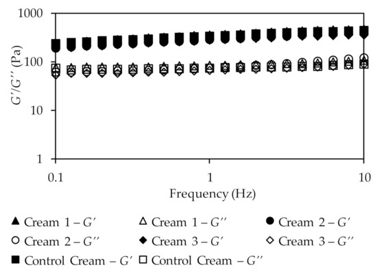 The olive oil industry by-products as well as their bioactive phenolic compounds have demonstrated antioxidant [9,14,15,16,17,18,19,20], anti-inflammatory [12,21,22,23,24,25,26,27,28,29], and photoprotector [15,26,30,31,32,33,34,35] activities. Additionally, their application has also been studied in the cosmetic and dermatology research field, for the treatment of skin diseases using different topical delivery systems [14,36,37,38,39,40]. Emulsions are one example of these delivery systems, which are usually composed by emollients, thickeners, humectants, preservatives, and water, among other ingredients. Emulsions are considered thermodynamically unstable and heterogenic systems, but are the most used vehicles in cosmetic industry, due to their efficacy, namely, hydration and emollience. Creams are an example of semi-solid emulsions. The incorporation of natural ingredients in creams, a tendency that has been increasing, may have an impact in their structure, leading to changes in their appearance and their physicochemical and rheological properties [41,42]. Therefore, the main aim of the present work was to evaluate the impact of incorporating three different olive oil industry by-products extracts (OIBPE) in skin care oil-in-water (O/W) creams, through their in vitro and in vivo characterization, and comparison with a control cream, not containing extracts.