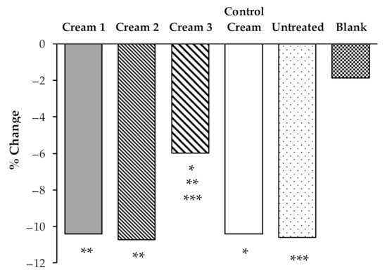 Effects of the application of the different creams on b*parameter changes before and after UVA irradiation. Mean values of all volunteers (n = 10). Untreated, was used as a control and a blank skin area was also used as a negative control. The statistical comparison between products and controls is also shown (*, **, ***: p < 0.05).