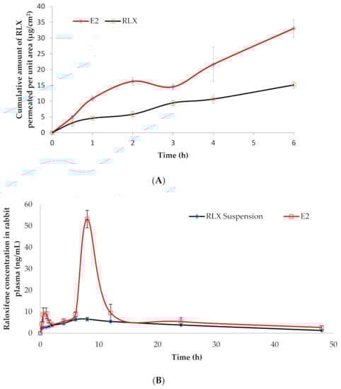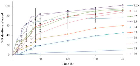 The postmenopausal state is characterized by a sharp fall in the estrogen levels circulating in plasma. Such a fall is responsible for various symptoms: Hot flushes, mood swings, sleep disorders, as well as metabolic changes, including cardiovascular diseases and osteoporosis. These symptoms collectively affect postmenopausal women’s quality of life. Consequently, they add up to be the foremost cause of morbidity and mortality in postmenopausal women [1,2,3,4]. Raloxifene hydrochloride (RLX) is a selective estrogen receptor modulator (SERM) that has shown to preserve the beneficial effects of estrogen mainly increased bone mineral density (BMD) [5] and decreased LDL-cholesterol [6], and, at the same time, has an antiestrogen effect on mammary tissues and the uterus [7,8]. RLX prevents the transcriptional activation of genes containing the estrogen response element in reproductive tissue. In vitro studies showed RLX inhibits the estradiol-dependent proliferation of human mammary tumor cells [9]. Thus, RLX is used to prevent and treat osteoporosis and decrease the risk of developing invasive breast cancer in postmenopausal women. Although RLX is rapidly absorbed following oral administration (Approximately 60%), yet its absolute bioavailability is only 2% [10]. This is mostly because RLX undergoes extensive first-pass metabolism to the glucuronide conjugates raloxifen-49-glucuronide, RLX 6-glucuronide, and RLX-6, 49-diglucuronide [10]. As well, RLX belongs to class II drugs according to biopharmaceutical classification system (BCS), that is, low solubility and high permeability.