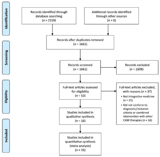After the literature search, 2259 records were retrieved, and 1661 titles and abstracts were screened after removing duplicates. Fifty-three eligible articles were assessed, and 37 articles were eliminated for various reasons, leaving 16 full-text articles [,,,,,,,,,,,,,,,] that met the inclusion criteria for final inclusion (Figure 1). All included studies were conducted in China and published between 2002 and 2020 in the Chinese language.