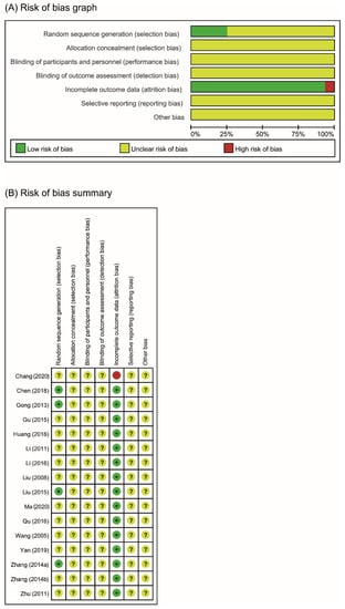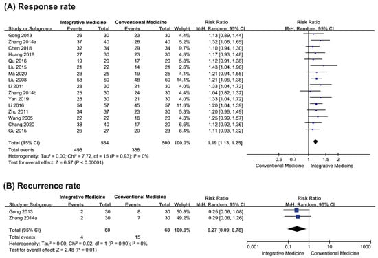 Sixteen studies assessed the total response rate. Six studies reported a superior effect of integrative medicine compared with drug therapy [,,,,,,,,,,,,,,,], while the other ten studies reported equivalent effects between the two groups. The meta-analysis showed a favorable effect towards integrative medicine (RR 1.19, 95% CI 1.13 to 1.25, n = 1034, p < 0.00001, I2 = 0%, low CoE, Figure 3A).