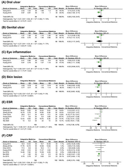 Forest plots of secondary outcomes. (A) Oral ulcers, (B) genital ulcers, (C) eye inflammation, (D) skin lesions, (E) ESR, (F) CRP.
