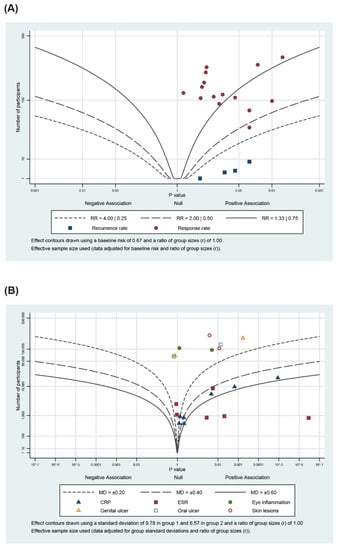 Clinical manifestations vary greatly among BD patients, and conventional therapy highly depends on the severity of the disease, which often involves several body systems and organs. The main principle of BD treatment via drug therapy remains to be subduing inflammation during attacks and improving patients’ quality of life by easing symptoms, increasing immunity, and reducing recurrence []. Although evidence supporting the use of azathioprine and cyclosporin A for ocular manifestations and interferon (IFN)α for mucocutaneous manifestations is available, evidence for vascular, gastrointestinal, and neurological involvement is still lacking []. To date, the effectiveness of drug therapy is based mostly on case reports/series and a limited number of RCTs.