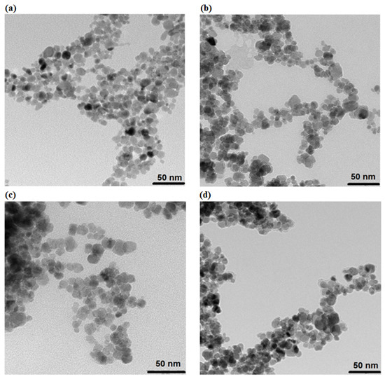 The studies of morphology were performed within the Transmission Electron Microscopy. The hybrid material (prepared with a coprecipitation technique, consisting of the spherical nanoparticles that have a size ranging from 10 to 15 nm) has a uniform surface and apparent aggregation. The aggregation that is presented on the TEM images is caused by the drying process onto a Formvar film covering the mesh for TEM analysis. As can be seen in Figure 1a, the SPIONs are having quite regular morphology and dispersity similar for the following samples. Figure 1b corresponds to the morphology studies of the SPIONs coated with citric acid (SPION@CA). The organic shell is too small to be clearly recognized. As can be seen, the morphology is nearby the same as for the sole SPIONs. Then the difference can be distinguished for SPIONs coated with citrates and loaded with an anticancer drug. Figure 1c shows the SPION@CA_Dox, while Figure 1d relates to SPION@CA_Epi. The superparamagnetic core can be clearly seen. The organic layer with loaded drugs for both TEM images Figure 1c,d are visible. Both doxorubicin and epirubicin have different densities than the magnetic core, so they as seen as the lighter layer coating core. The thickness of the organic shell is below 2 nm.