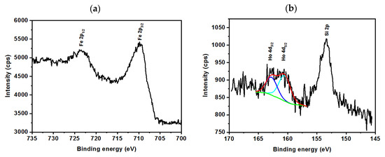 Following spectra presented in Figure 3a, shows the region characteristic to Fe 2p binding energies, where two peaks related to the Fe 2p1/2 about 723.6 eV and Fe 2p3/2 about 710.2 eV are clearly seen. These peaks are ascribed to Fe3+ ions occupying octahedral sites. The iron oxide results are in good agreement with the literature [55,56]. Figure 3b shows the spectrum at the range that is characteristic of the Ho 4d. As can be seen, two peaks for binding energies about 160.5 eV and 162.7 eV can be deconvoluted into peaks for Ho 4d3/2 and Ho 4d5/2. It can be ascribed to Ho3+ ions that are incorporated into the structure of iron oxide nanoparticles [57]. The following band of about 153.3 eV binding energy comes from the Si 2p present in the carbon-based tape containing a small number of additives like Si-based compounds, such as siloxane. The high noise in comparison to the signal for holmium is caused by the low Ho content in the samples. In this work, only about 1% molar was incorporated into the iron oxide lattice.