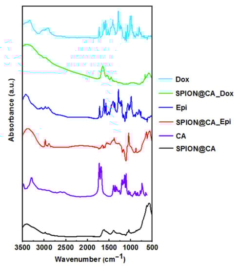 FT-IR spectra for Dox, Epi, SPION@CA, SPION@CA_Dox, and SPION@CA@Epi.