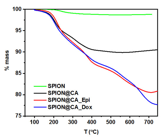 In the case of citric acid-modified SPIONs, it can be seen that the organic shell constitutes about 10% ± 1.0% by the weight of the entire carrier. Such an amount of citric acid is sufficient to stabilize SPIONs. On the basis of these data and the analysis of the TGA result of the synthesized conjugate, the amount of the drug attached to the nanoparticle can be determined.