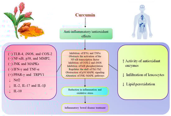 Curcumin’s potential and molecular targets in inflammatory bowel disease (IBD) treatment, adapted from [25,66,67,68,69,70,71,72,73,74].