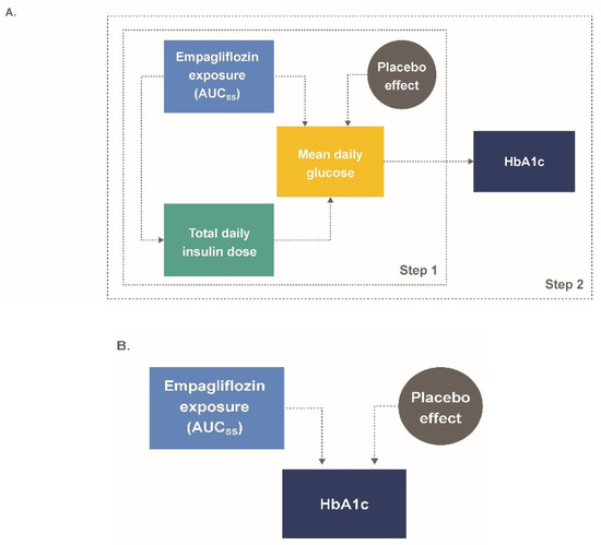 The time course of HbA1c was initially planned to be estimated via an indirect-response model but, due to identifiability issues, a simpler direct-effect model was implemented. This was driven by the information content of the data (i.e., the timing of the endpoint collections did not support identification of indirect-response model parameters). The direct-effect model assumed that the exposure-related effect of empagliflozin was at steady-state (and so was time-independent) prior to the collection of the first HbA1c sample collections at week 4 of the studies.