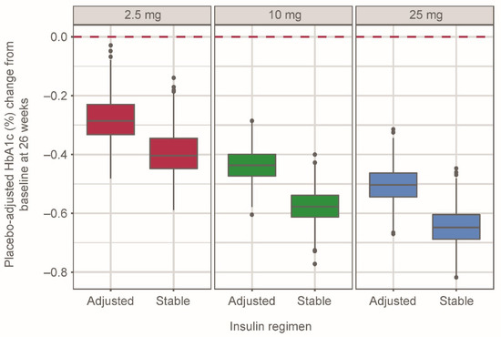 The simulated median (95% CI) placebo-adjusted HbA1c change from baseline at week 26 for empagliflozin 2.5 mg qd was −0.29% (−0.40%, −0.10%) and −0.40% (−0.53%, −0.23%) with adjusted and stable insulin therapy, respectively (Figure 2). In the 10- and 25-mg groups, median (95% CI) placebo-adjusted changes in HbA1c at week 26 were −0.44% (−0.55%, −0.33%) and −0.50% (−0.63%, −0.38%), respectively, with adjusted insulin therapy and −0.58% (−0.69%, −0.46%) and −0.65% (−0.78%, −0.52%), respectively, with stable insulin therapy.