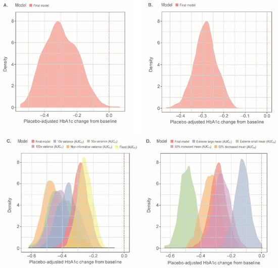 Distributions of simulated median placebo-adjusted HbA1c (%) change from baseline at week 26 for a 2.5-mg empagliflozin treatment arm in the EASE-2 population: (A) with the semi-mechanistic model; (B) with the descriptive model; (C) with different prior variances; (D) with different prior means. Distributions represent simulated median values for 500 replicates including parameter uncertainty for each respective model. Extreme large mean: 22,026 nmol·h/L; Extreme small mean: 0.00005 nmol·h/L. AUC50, AUCss leading to 50% of maximal effect; AUCss, area under the curve at steady-state; HbA1c, glycated hemoglobin.
